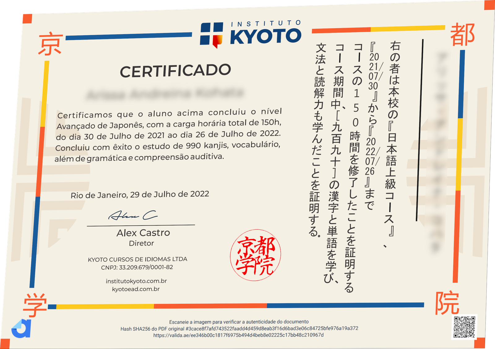Ao final do curso, você receberá o certificado digital em português e japonês.